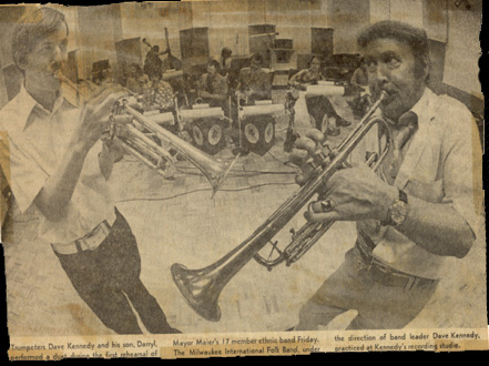 | Trumpeters Dave Kennedy and his son, Darryl, performed a duet during the first rehersal of Mayor Maier's 17 member ethnic band Friday. The Milwaukee International Folk Band, under the diection of band leader Dave Kennedy, practiced at Kennedy's Recorfing Studio. |