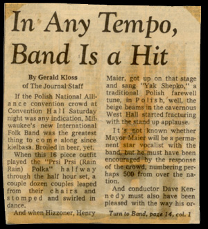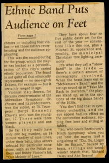 This was the second outing for the group, which the mayor has backed as a personification of this city's varied ethnic population. The band is not quite all that ethnically represented - no one-eight Eskimo, for example---but it certainly ranged in age. Violinist Ray Brown, for decades concertmaster of the Milwaukee Symphony Orchestra and its predecessors, was the eldest, at 75. Trumpeter Darryl Kennedy (Daves son) was the youngest 17. There were three women players and one black. So far they really have only one big number, an 18 minute medely of nine tunes, under the their belts, plus others selected for particular occasions, such as the Polish anthem and Bobby Vinton's hit, "Our melody of Love." |