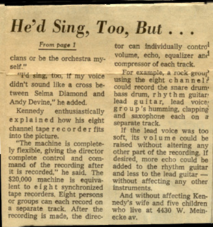 Kennedy's theory was that if Les Paul and Mary Ford could sound like several voices and instruments then "I could record all the instruments in an orchestra and become my own one man orchestra." After 10 years of practice, Kennedy's theory developed into a big band sound. "I'm a proffesional musician and my lifes ambition was to become a band leader. I was determined to make a hit record and needed the money to do it," he said. So he borrowed $4,000. Kennedy's friend Ed Giese, helped him with the electronics of multitracking. "At first we practiced at Ed's house. We ere too noisy and his wife couldent stand it. Then we set up at our house and my wife kicked us out. We had nowhere to go, so we rented a studio," Kennedy explained. His first studio was located at 4504 W. North av.