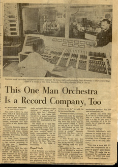 Versitility is the key to much of Kennedy's sucess. His knowledge in musical arranging and composing combined with his knowledge as a recording engineer is a marketable product. His one man orchestra is, too. A person can walk into Kennedy's studio with an idea of a song in his head and in a day or two have a disk recording of it in his hands, the 42 year old entrepreneur said. Orders Pressings Kennedy individually cuts acetates or record dubs on a lathe in his studio. He orders pressings from Chicago and claims "24 to 48 hour service." "You sing a song and I'll write the composition on a piece of paper," said Kennedy. "Then I'll make the arrangement for orchestra and chorus. I'll either hire musicians